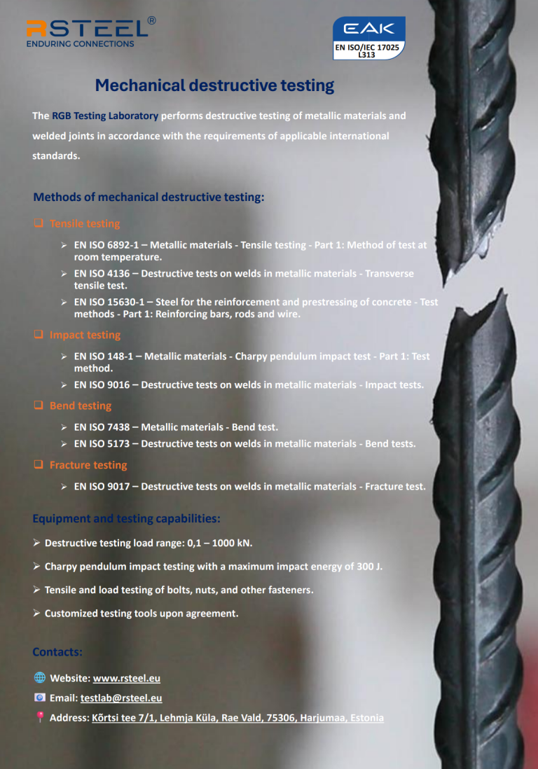 RGB-testauslaboratorio suorittaa metallimateriaalien, hitsattujen liitosten ja raudoitteiden mekaanisten ominaisuuksien määrittämiseksi tuhoavia testejä. Testaukset tehdään kansainvälisten standardien mukaisesti nykyaikaisilla laitteilla, mikä varmistaa tulosten tarkkuuden ja luotettavuuden.