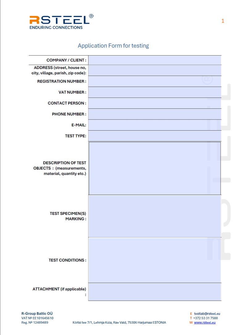 Please fill out the online application below or download order form and send e-mail to testlab@rsteel.eu, and our technicians will be in contact with you as soon as possible.