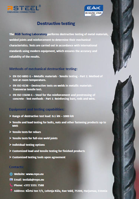 The RGB Testing Laboratory performs destructive testing of metal materials, welded joints and reinforcement to determine their mechanical characteristics. Tests are carried out in accordance with international standards using modern equipment, which ensures the accuracy and reliability of the results.